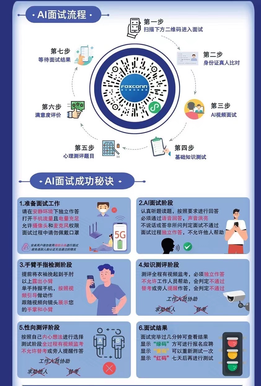 目前富士康員工招聘是需要提前做AI線上面試的,如龍華富士康、觀瀾龍華富士康、鄭州綜保區(qū)龍華富士康、贛州龍華富士康等,已啟用AI面試、并減少人工面試,到招募中心前需必須完成AI面試、否則刷身份證系統(tǒng)檢測(cè)不到有效AI面試數(shù)據(jù),不可進(jìn)入招募中心進(jìn)行體檢。