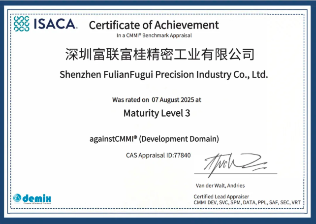 近日,富士康工業富聯正式通過全球軟件領域權威認證CMMI(Capability Maturity Model Integration)即能力成熟度模型集成3級評估,這標志著公司在項目管理、流程規范、軟件開發、服務交付等多方面能力達到國際認可標準。
